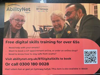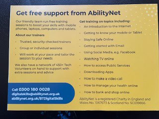 We are delighted to announce that AbilityNet are holding digital skills training in our gardner hall on 13th/20th/27th January at 2pm for all over 65’s who need help with accessing their phone/tablet etc