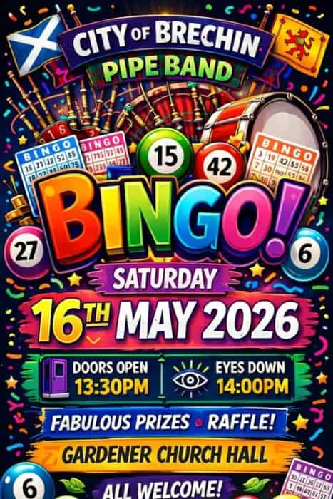 Come along and support Brechin’s own Pipe Band as they hold a Bingo Afternoon in the Gardner Hall on Saturday 16th May from 1.30pm