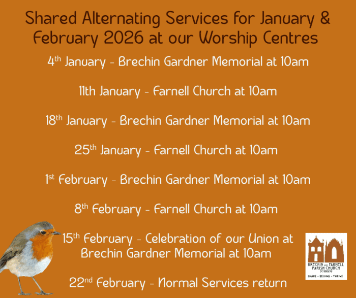 We are the Gardner Memorial Church of Scotland Brechin, and we are united with Farnell Church. Our congregational name is Brechin & Farnell Parish Church which means we are one congregation with two places of worship. Town & Rural.